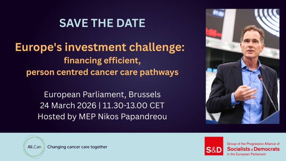 Save the date for All.Can’s event at the European Parliament: “Europe’s investment challenge: financing efficient, person-centred cancer care pathways” taking place on 24 March from 11:30-13:00 CET