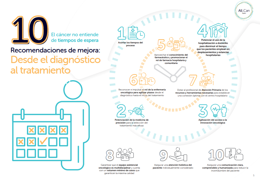 The Scientific Committee of All.Can Spain has appeared before the Health Committee of the Spanish Congress of Deputies, to present its 2nd report titled: “Cancer does not understand waiting times. 10 recommendations for improvement: From diagnosis to treatment”, which emphasizes the importance of time and highlights ten new recommendations with the primary goal of shortening the time, and improving the patient’s quality of life and overall well-being throughout the process. This report also stresses current inefficiencies in the healthcare system, underlining the need to address them in order to achieve a more efficient and equitable care circuit.